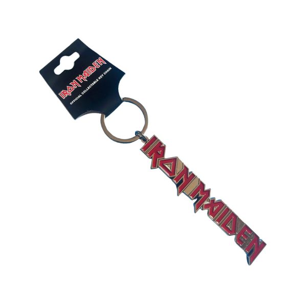 Llavero OFICIAL de Iron Maiden. Logo con letras rojas. Diseño con relieve fundido a presión.