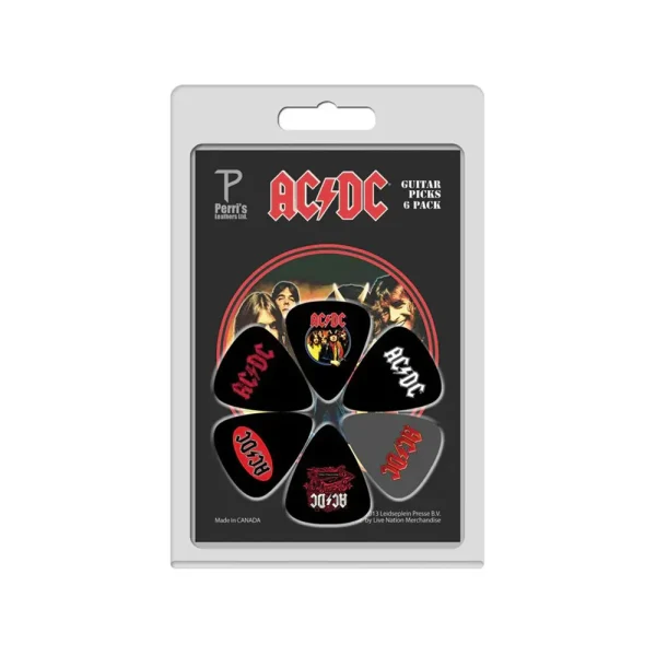 Pack de 6 uñetas de AC/DC, con diseños de algunos de sus logos tomados de diferentes álbums.
